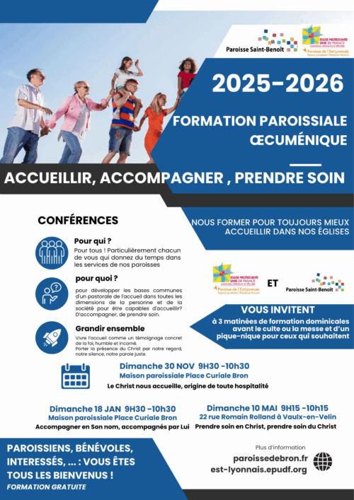 Le Christ nous accueille, origine de toute hospitalité – Dimanche 30 novembre de 9h30 à 10h30 à la maison paroissiale, place Curiale à Bron- Accompagner en Son nom, accompagnés par Lui – Dimanche 18 janvier de 9h30 à 10h30 à la maison paroissiale, place Curiale à Bron